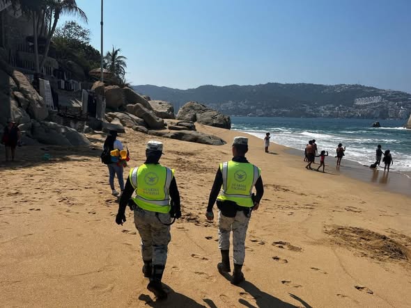 Con presencia territorial y contacto directo con la población, elementos de la Guardia Nacional mantienen vigilancia permanente en distintas playas de Acapulco mediante recorridos a pie y en cuatrimotos, principalmente en zonas de alta afluencia turística.